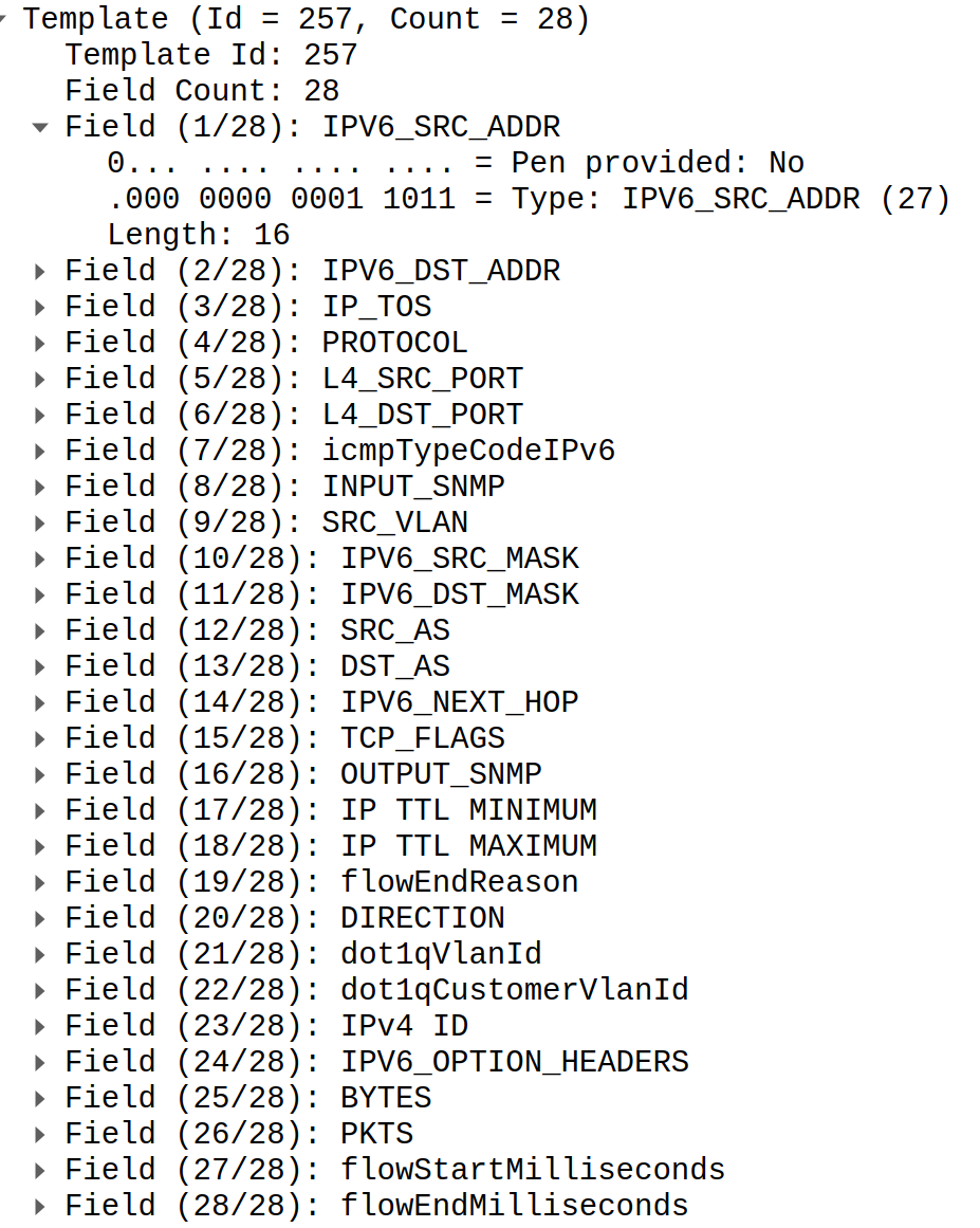 Each IPFIX packet carries some information about network traffic (source and destination IPs, protocol, source and destination ports, number of packets and octets) accompanied by meta information from router itself (source and destination interfaces, source and destinations ASNs, VRF IDs). You can find example IPFIX packet decoded by Wireshark below.