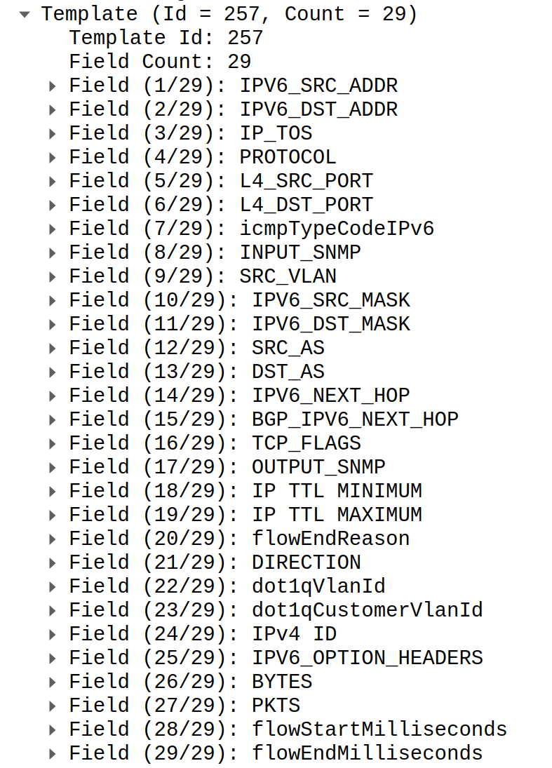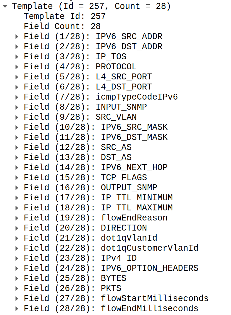 You can understand importance of order now. If we misplace any field in template or data we will read some other field and it will lead to exceptionally bad outcome. For example, we expect traffic length but instead we read field which carries interface ID which may be in range of hundreds millions easily. As outcome we will see huge spike of bandwidth and potentiality false positive DDoS attack detection.