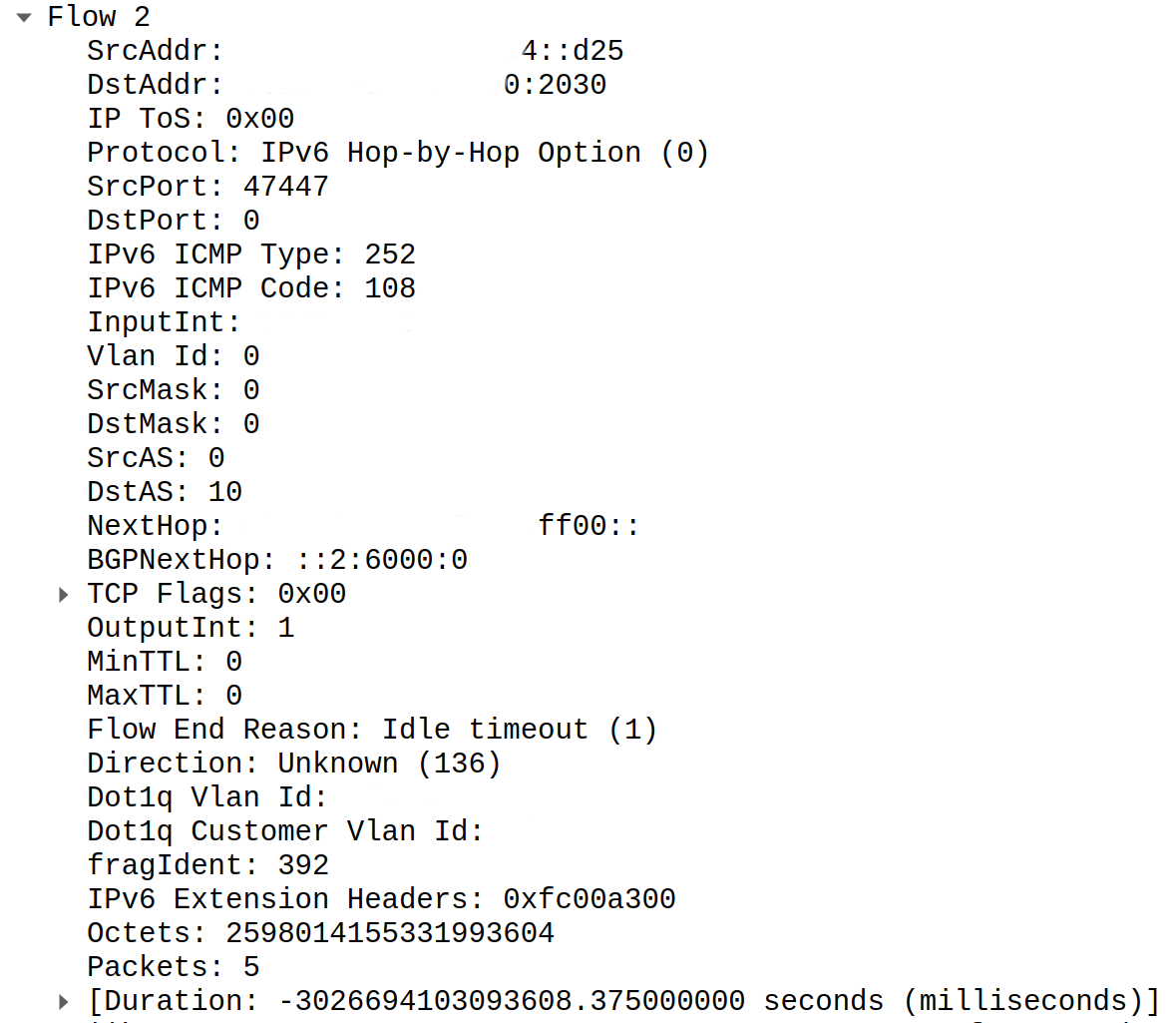 What should we do in such cases? RFC recommends to stop receiving any traffic from this router and log warning message. Sadly it will lead to complete loss of visibility for IPv6 protocol. In this particular case issue did not affect IPv4 protocol and telemetry worked just fine for it.