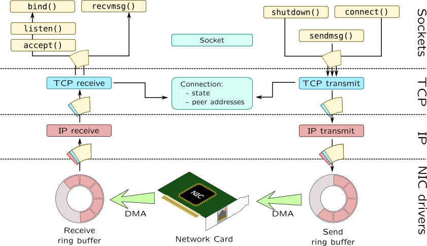 We will focus only on layers 3 and 4 of OSI model as regular Telecom equipment (routers, switches) does. On this diagram kindly provided by Sergey Klyaus we will cover only two bottom levels: IP and NIC drivers.