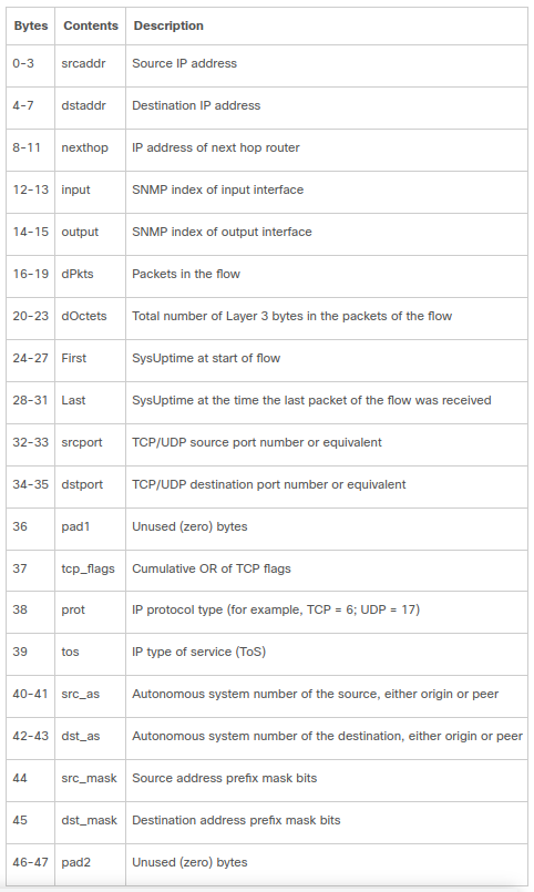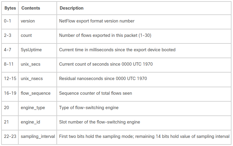 This part does not carry anything about traffic itself but required for Netflow collector implementation. For example field sampling_interval is absolutely necessarily for our needs as it carries number of skipped (sampled out) packets during observation. Let's look on flow encoding format. Each Netflow v5 packet can carry multiple (usually 12-15) flows which describe traffic observed by router. You can find full list below.