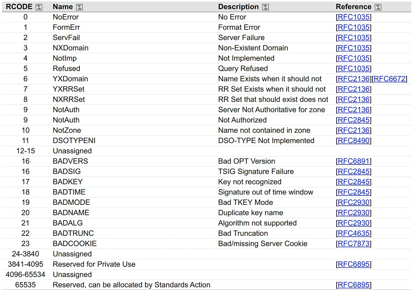 The server responded! How do you know if the search for the requested name was successful? We look more closely and see the rCode field. What does a qualified programmer do? He/she goes to the IANA site and looks at the allowed values for this field: