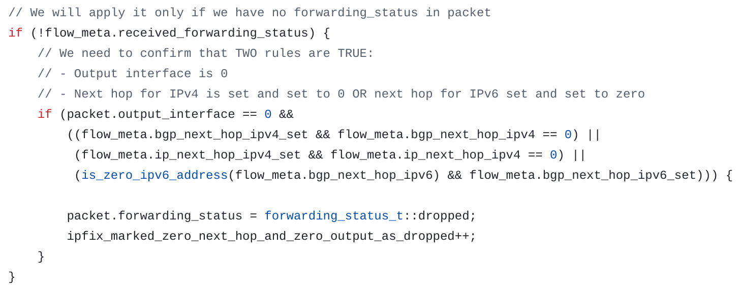 I hope some day JunOS development team will introduce RFC compliant Forwarding Status to encode dropped traffic and we will be able to remove such complex logic from our product.