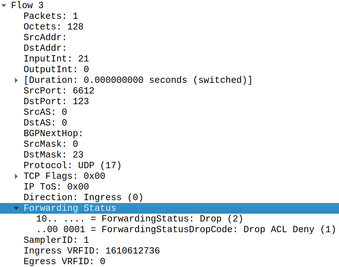 Let's look how major vendors report discarded traffic in their network traffic telemetry.