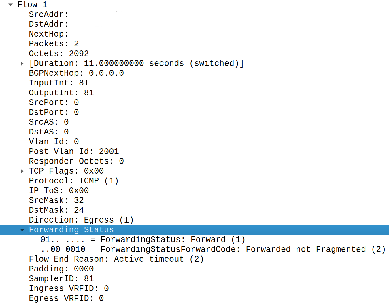 Do we have forwarding status field here? No, it's clearly missing. I repeated my tests on latest stable JunOS and even on it fields forwarding status was missing.