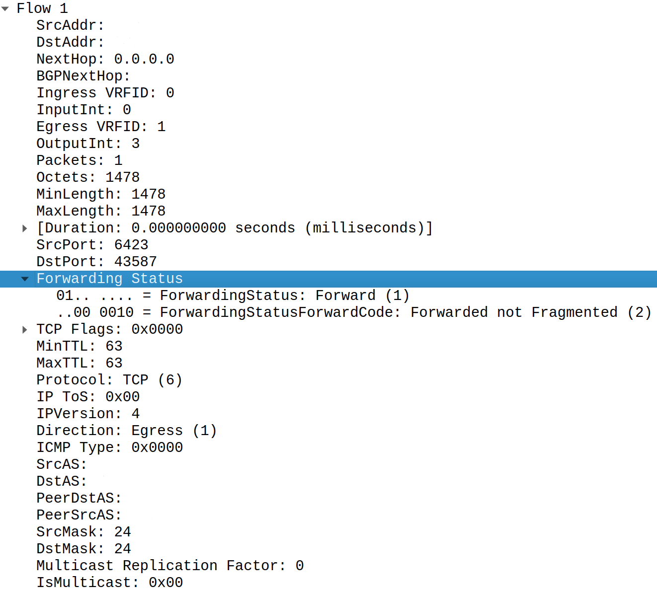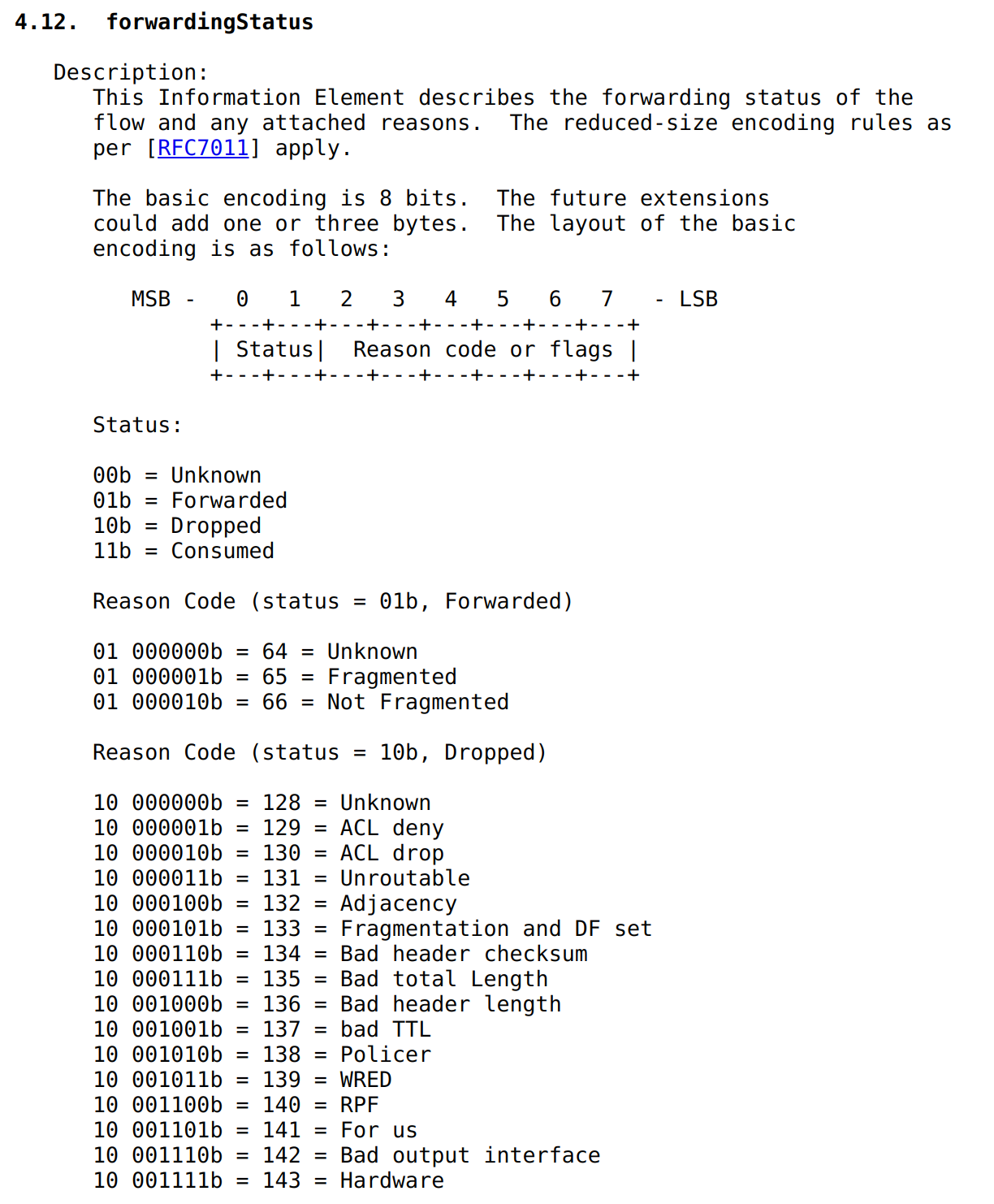 Cisco uses forwarding status field in Cisco ASR 9000 for both Netflow v9 and IPFIX telemetry: