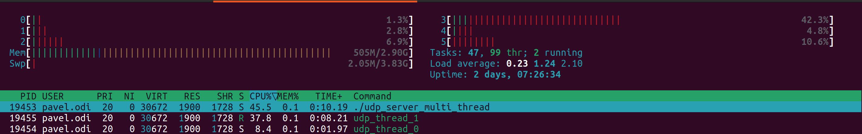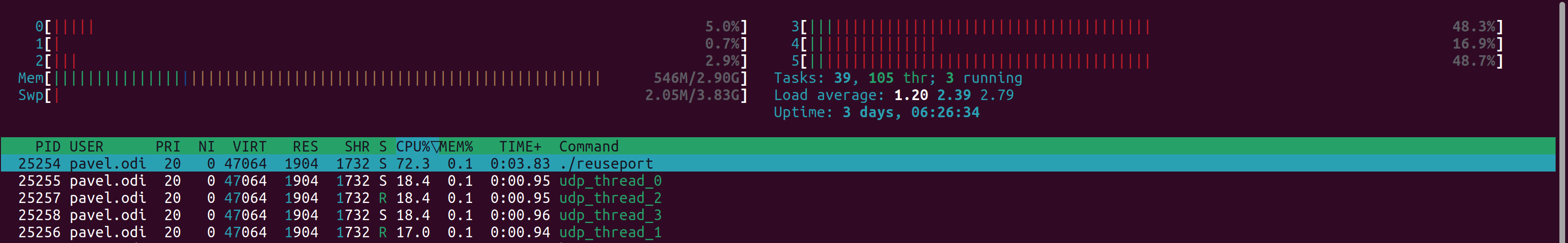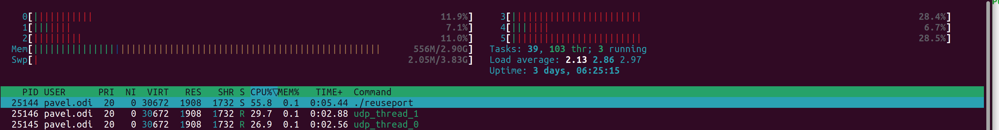 Due to nature of traffic in my particular case (majority of traffic is coming from single device) standard Linux kernel load balancing algorithm did not distribute it well and we were limited in options to use more threads to process UDP traffic. For tests in this article I used Ubuntu 22.04 with Linux kernel 6.2.0-26-generic.